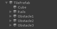 - Créez 3 GameObjects à l'intérieur de l'objet "TilePrefab" et nommez-les "Obstacle1", "Obstacle2" et "Obstacle3"