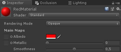 - Créez un nouveau matériau, nommez-le "RedMaterial" et changez sa couleur en rouge, puis attribuez-le au cube (c'est juste pour que l'obstacle soit distingué de la plate-forme principale)