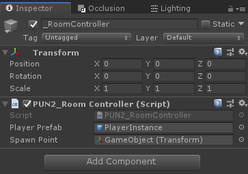 - Attachez le script PUN2_RoomController à l'objet _RoomController