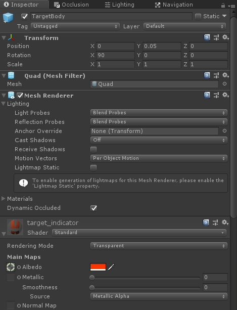 - Ensuite, il faut créer un indicateur cible préfabriqué. Il s'agit simplement d'un simple GameObject avec un Quad qui indiquera où nous avons cliqué sur la carte.