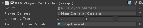 - Et enfin, sélectionnez 'RTSPlayer' et attribuez toutes les variables nécessaires dans le script RTSPlayerController: