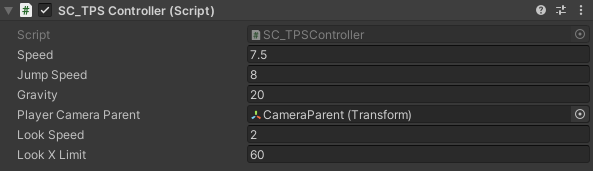 }- Attachez le script SC_TPSController à l'objet "Player" (vous remarquerez qu'il a également ajouté un autre composant appelé Character Controller. Changez sa valeur centrale en (0, 1, 0))