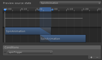 - Cliquez sur la flèche de transition et dans la vue Inspecteur sous Conditions, cliquez sur (+) et assurez-vous que le paramètre spinTrigger est sélectionné