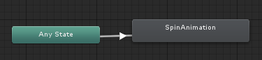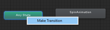 - Enfin, sélectionnez "Any State" -> Faites un clic droit dessus -> Créer une transition, puis pointez sur SpinAnimation: