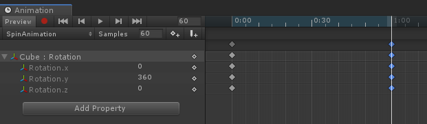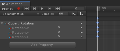 - Dans la fenêtre d'animation, cliquez sur AddProperty -> Transform -> Rotation