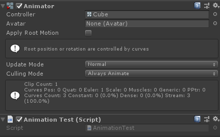 }- Attachez le script AnimationTest.cs au cube avec le composant Animator: