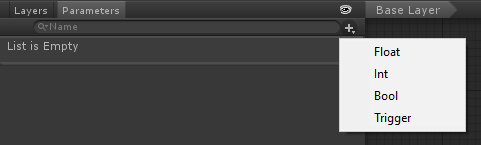 Vous remarquerez qu'il existe plusieurs types disponibles, mais pour l'instant, nous allons sélectionner Trigger, il est similaire à bool mais contrairement à bool, il est automatiquement défini sur false une fois l'animation terminée terminé, utile pour les animations one-shot: