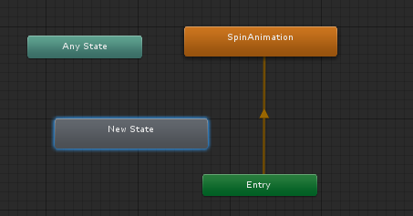 - Vous remarquerez qu'il y a une flèche pointant du "Entry" vers le "SpinAnimation", ce qui signifie que l'animation se jouera dès que la scène commencera, mais ce n'est pas ce que nous voulons, nous voulons pour ne jouer l'animation qu'en appuyant sur une touche.