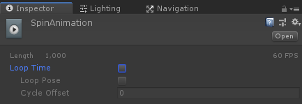 - Par défaut, les animations créées avec Unity ont une boucle activée, mais comme nous ne voulons lire l'animation qu'une seule fois, nous devons sélectionner le clip d'animation dans la vue Projet, puis décocher la case Temps de boucle: