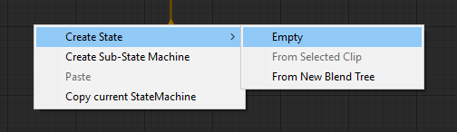 - Clic droit sur la fenêtre Animator -> Créer un état -> Vide: