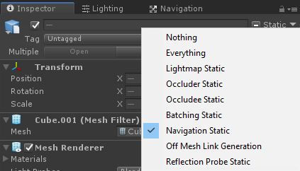 - Sélectionnez tous les objets de la scène qui seront statiques (Ex. Terrain, Arbres, etc.) et marquez-les comme "Navigation Static":