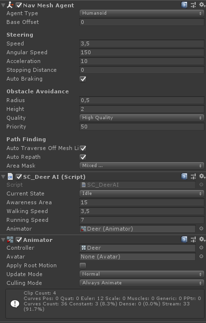 }- Placez le modèle de cerf dans la scène et attachez un agent NavMesh, un script SC_DeerAI et Composant Animator: