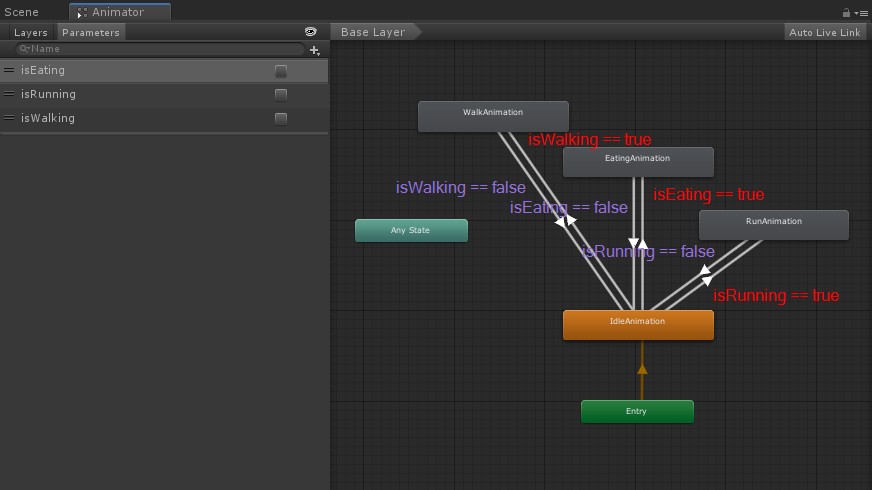 Le composant d'animation nécessite un contrôleur avec 4 animations: Idle Animation, Walking Animation, Eating Animation et Running Animation, et 3 paramètres booléens: isEating, isRunning et isWalking:
