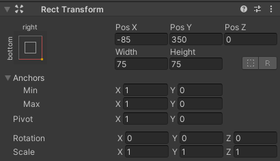 - Définissez les valeurs "JoystickRight" Rect Transform de la même manière que dans la capture d'écran ci-dessous: