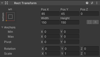 - Définissez les valeurs "JoystickLeftButton" Rect Transform de la même manière que dans la capture d'écran ci-dessous: