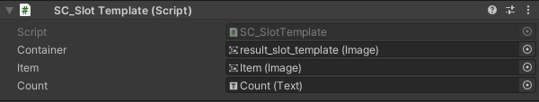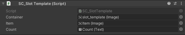 - Attachez le script SC_SlotTemplate à l'objet "slot_template" et attribuez ses variables (le composant Image sur le même objet va à la variable "Container", l'image enfant "Item" va à la variable "Item" et un enfant "Count" Le texte va à la variable "Count")