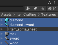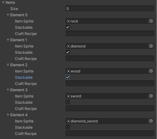 - Dans SC_ItemCrafting, modifiez la taille des éléments à 5 et attribuez chaque sprite à la variable Item Sprite.