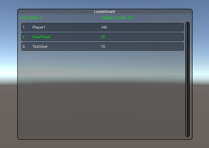 Une fois que tout est configuré, lorsque vous cliquez sur Classement, il devrait charger votre score/rang avec les 100 meilleurs joueurs en fonction de leurs scores: