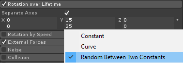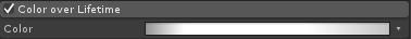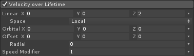 - Dans Particle System, activez ces modules: Émission, Forme, Vitesse sur la durée de vie, Couleur sur la durée de vie, Taille sur la durée de vie, Rotation sur la durée de vie, Forces externes, Rendu.