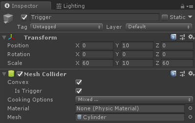 - Ajoutez le composant MeshCollider à "Trigger" GameObject, cochez les cases Convex et IsTrigger et modifiez son maillage en cylindre par défaut.
